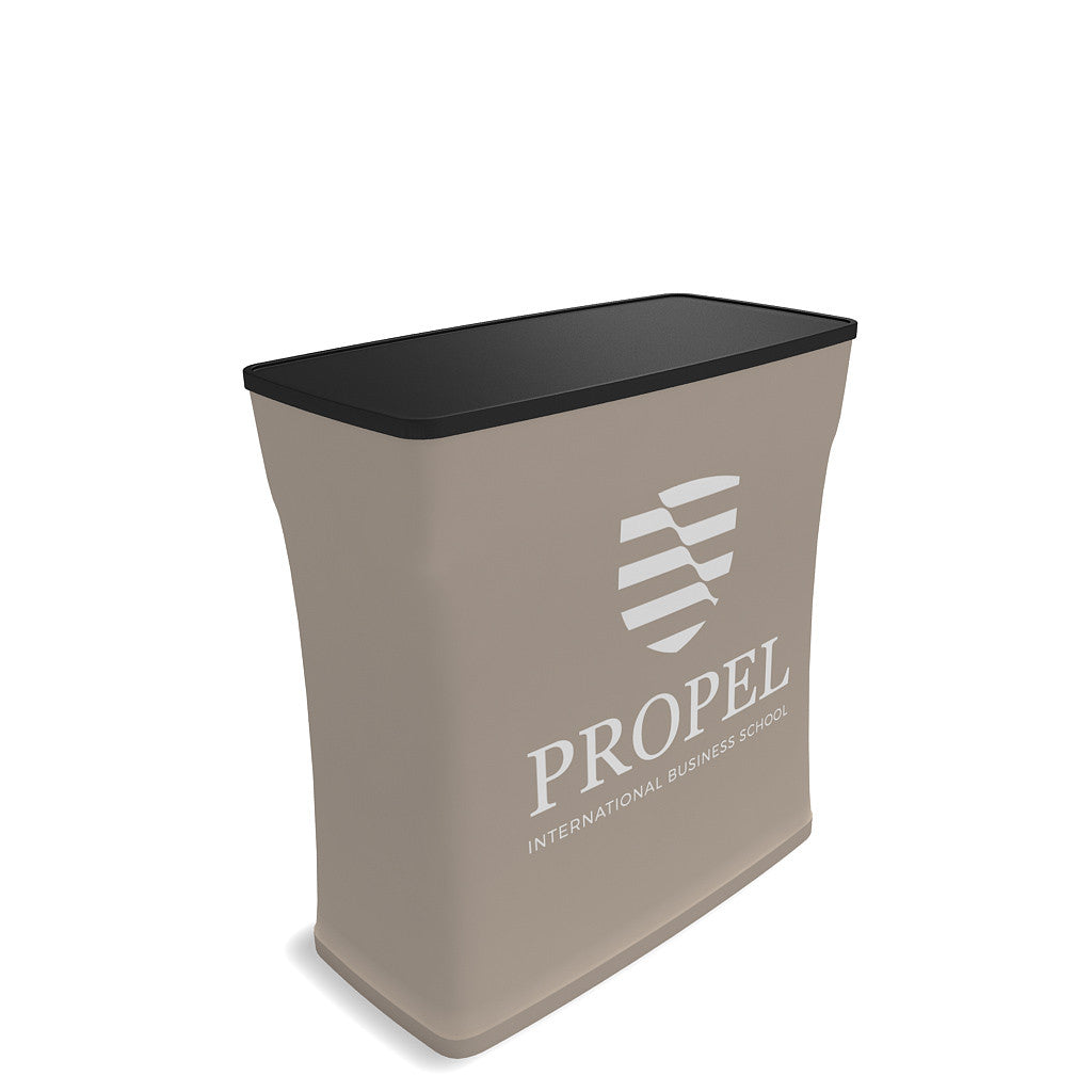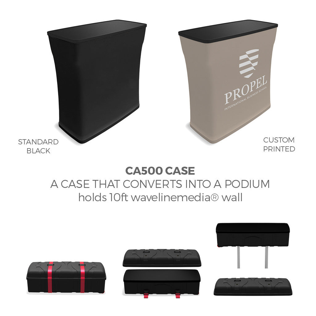 The CA500 Case to Counter comes standard with a black wrap. Add on custom wrap graphics for additional cost. A great case to counter trade show display solution for our OneFabric and show displays. Includes handle and wheels for easy transport.
