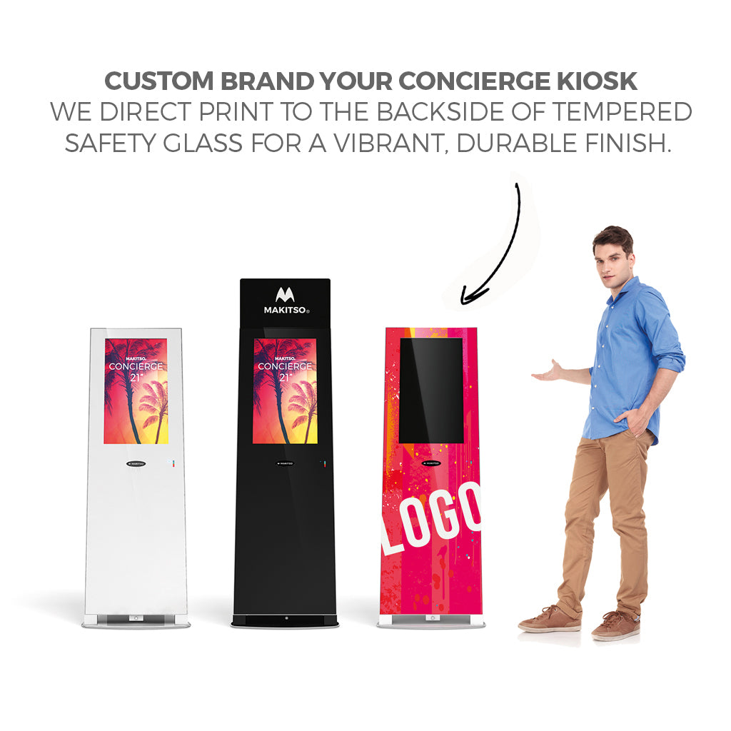 The front face of the ® Concierge is protected with a 5mm thick tempered safety glass which can be printed on the reverse side with vibrant color, branding or imagery that is scratch resistant. Built in USB camera can be used for video calls, surveillance, smart advertising, and much more!